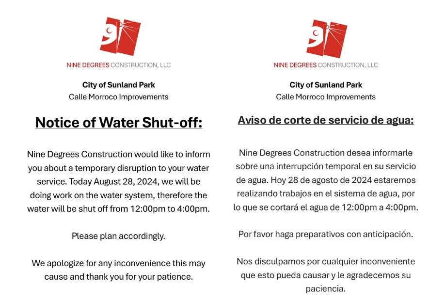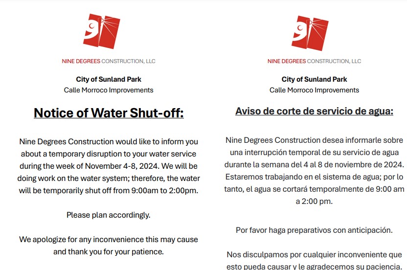 - Notice of Water Shutoff - Calle Morroco Nov. 4-8, 2024/interrupción temporal de su servicio de agua (Posted 11-02-2024 @ 8:12 a.m.)