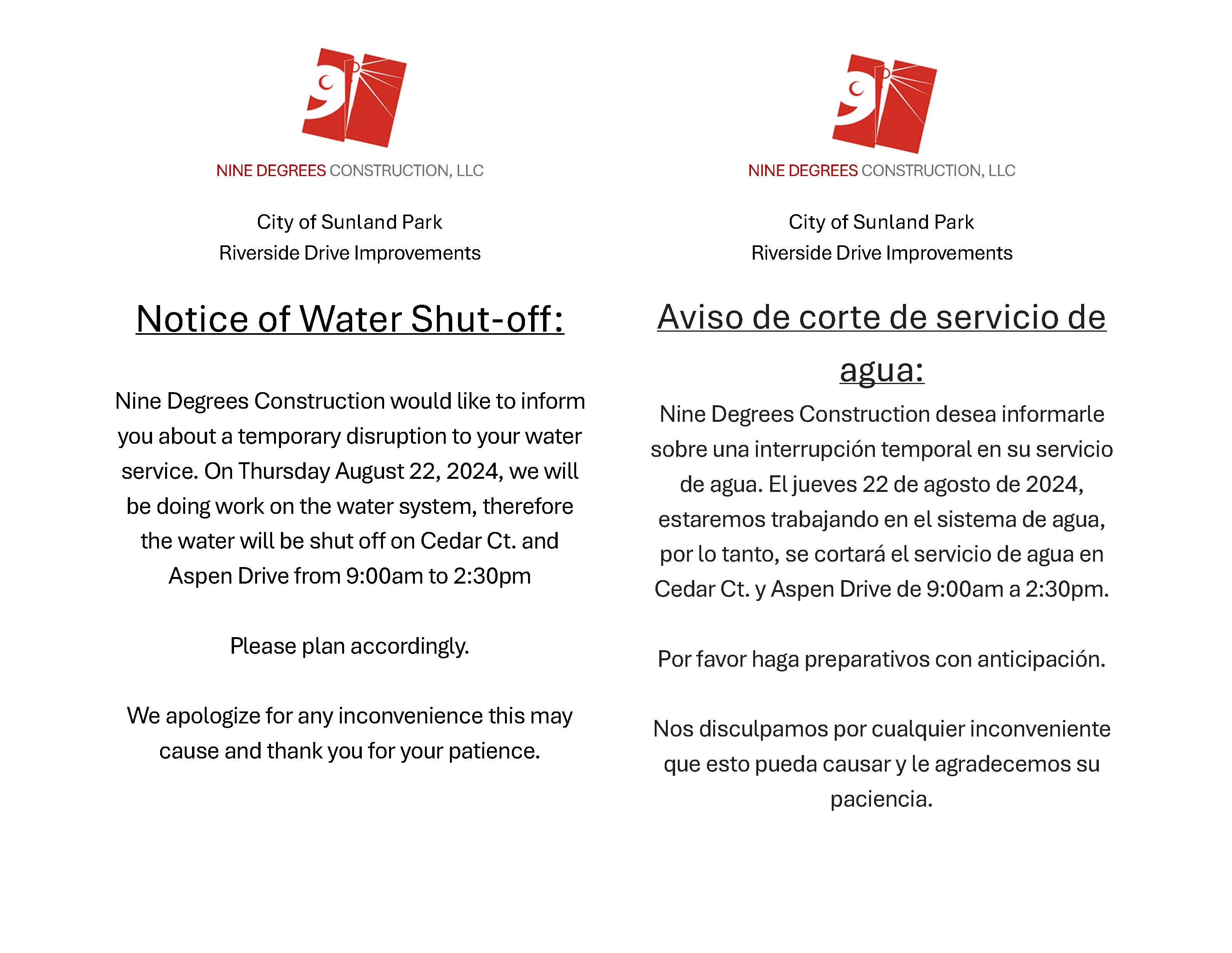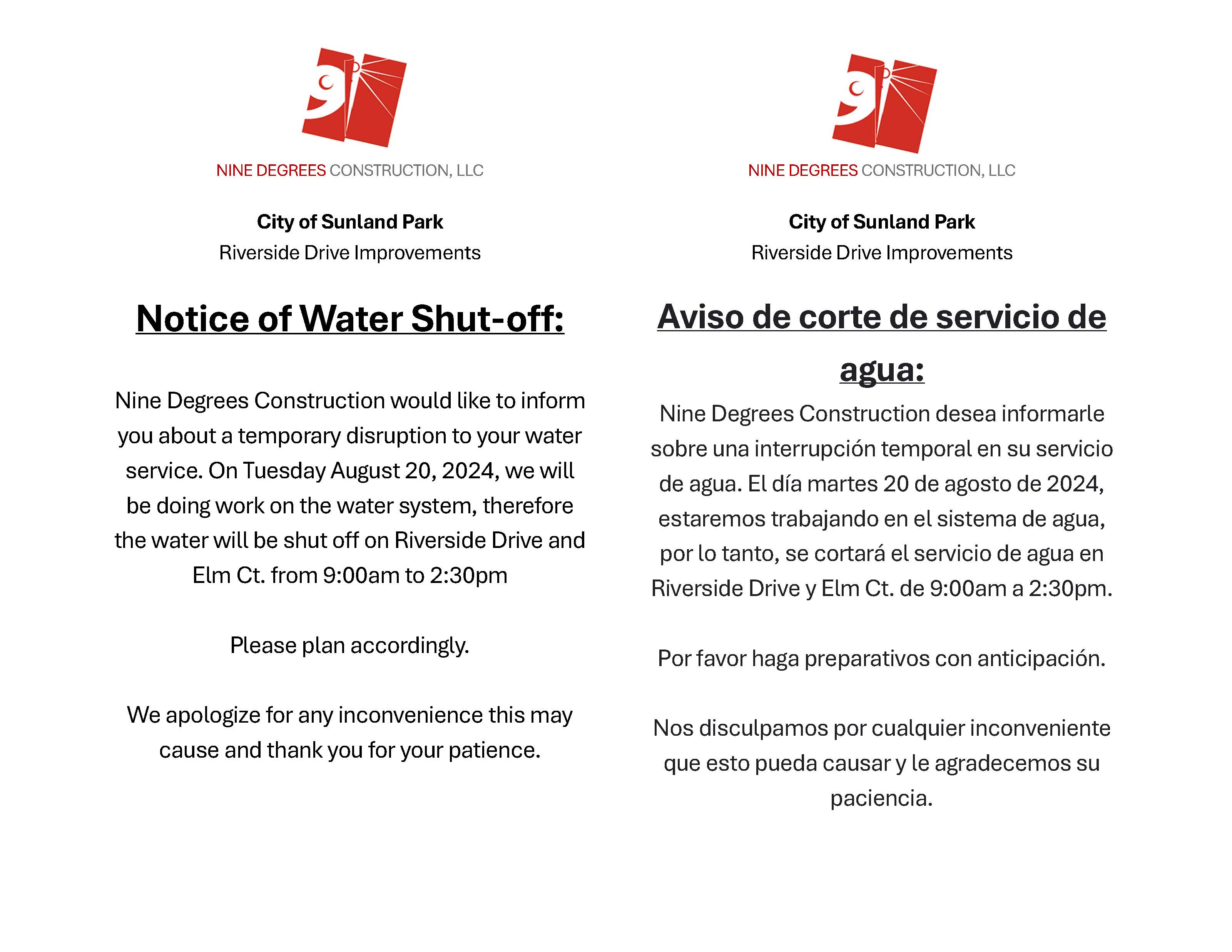 - From Nine Degrees Consgtruction, LLC: RIverside Drive Improvements Notice of Water Shutoff (Posted 08-16-2024 @ 10:52 a.m.)