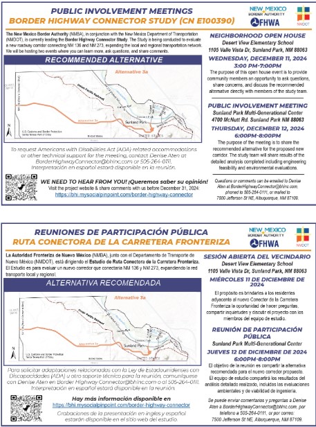 - Public involvement meetings on the Border Highway Connector Study. The New Mexico Border Authority and Department of transportation will be hosting two events where you can learn more, ask questions, and share comments. Your input is important so please consider attending. More information. (Posted 11-27-2024 @ 11:08 a.m.)